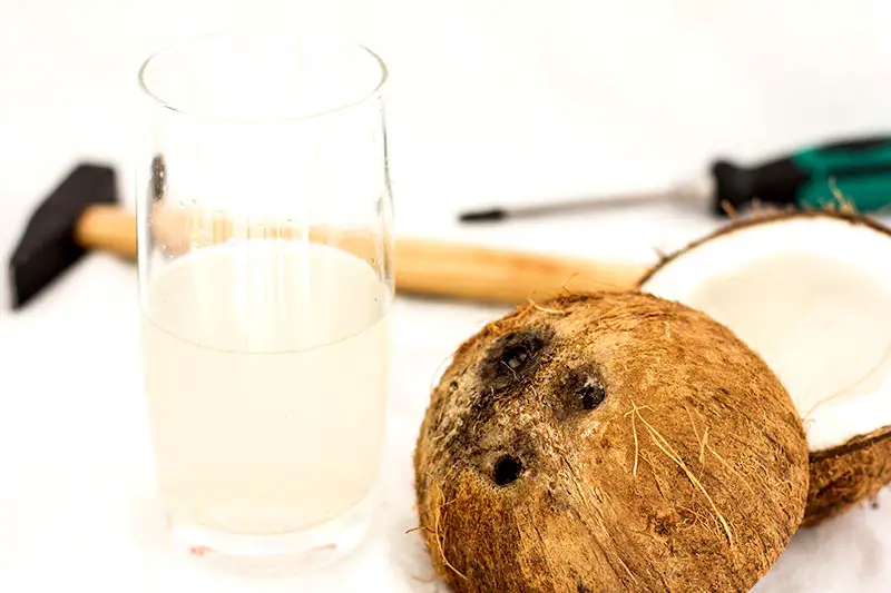 Am schnellsten öffnet ihr die Kokosnuss mit einem spitzen Schraubenzieher bzw. Breiten Nagel und einem Hammer. Wer geübt ist, der schafft das in nicht einmal 10 Sekunden 😉