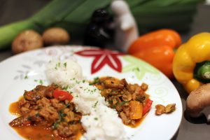 - In einer Pfanne erhitzen wir das Olivenöl und geben anschließend die Sojaflocken hinzu. Diese braten wir mit dem Tomatenmark richtig scharf an und geben danach noch die Champignons und den Lauch dazu.