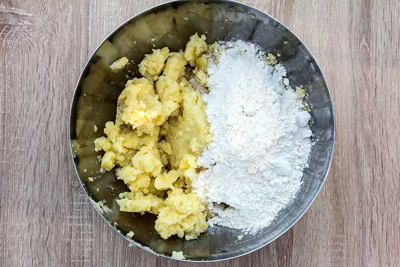 Als nächstes geben wir das Mehl zu den gestampften Kartoffeln dazu.